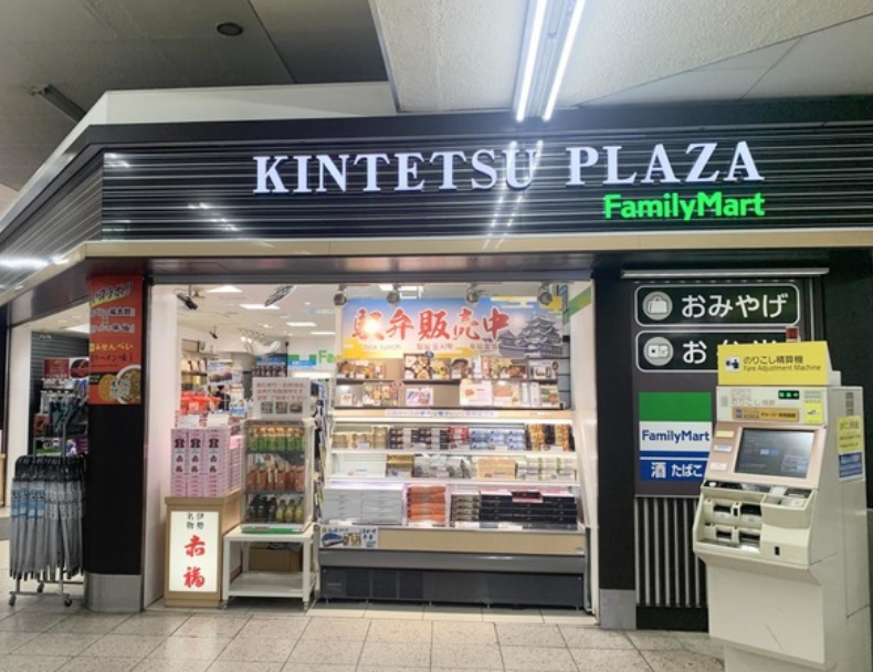 ファミリーマート(改札内)駅弁コーナーが設けられており、近鉄特急コラボの「ひのとり弁当」や「しまかぜ弁当」などが並ぶことがあります。売り場は地下改札内中央店1番ホーム前店など複数。