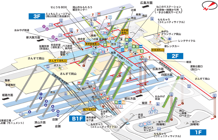 「新幹線・在来線の2つの改札を中心に、改札内コンコース・さんすて岡山(駅ビル)・地下通路が立体的につながる構造」