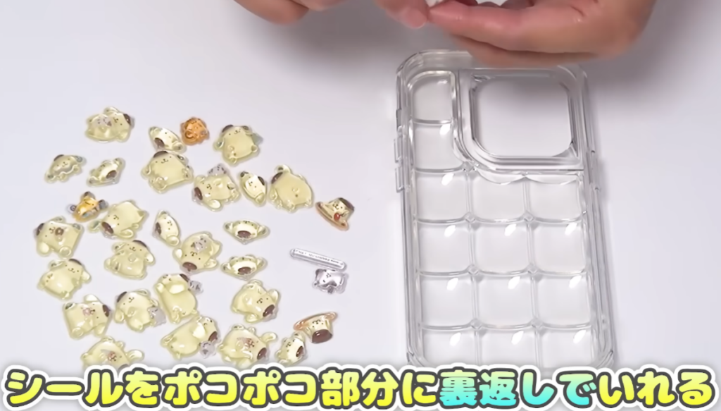 ポコポコケースの内側(スマホ本体が当たる面)にある窪みに、シールの表面を下にして置きます。