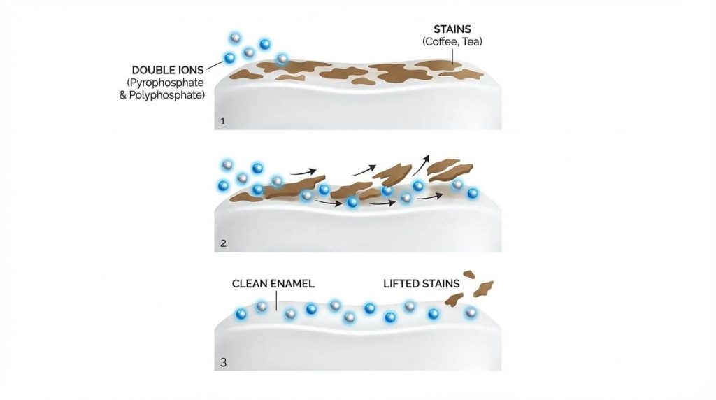 秘密は、イオンの力で汚れを浮き上がらせるダブル成分の配合にあります。これにより、摩擦に頼らない効率的なホワイトニングケアが実現しました。新しくなった成分の仕組みと追加されたメリットについて、詳しく解説します。