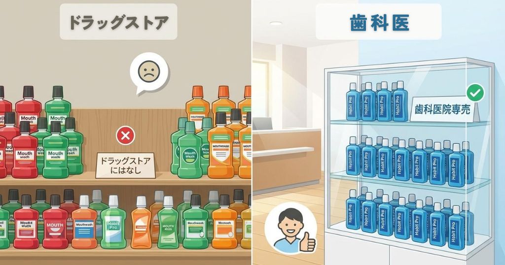 歯科医院の受付横にある物販コーナーをチェックしてみてください。スタイリッシュなブルーのボトルが並んでいれば、それがプロ御用達のハビットプロです。