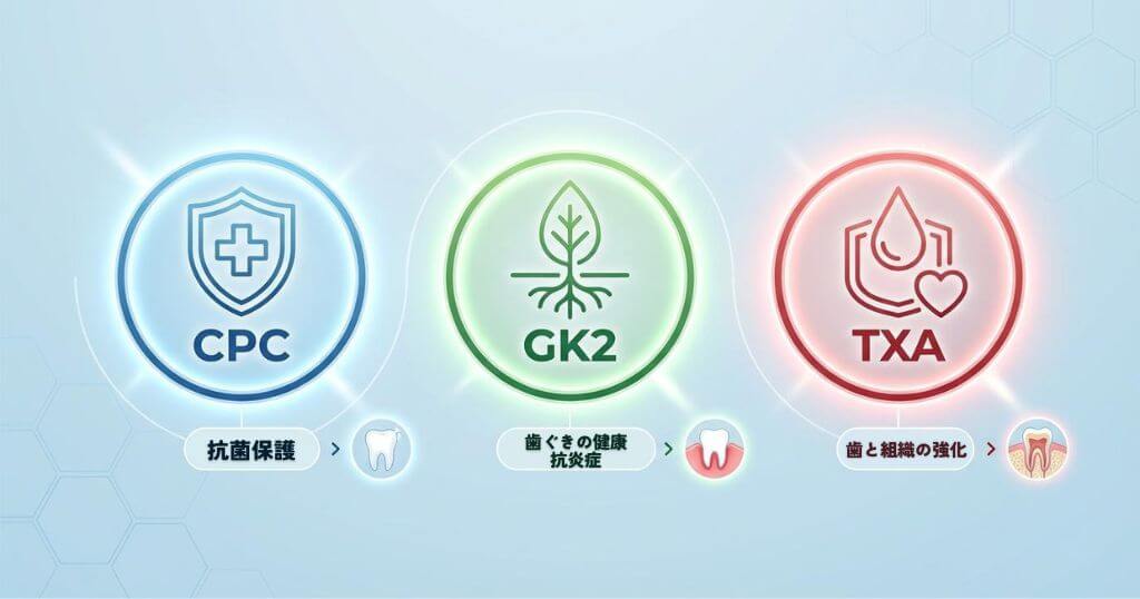 ハビットプロには、お口の健康を多角的に守るための3つの主要成分がバランスよく配合されています。