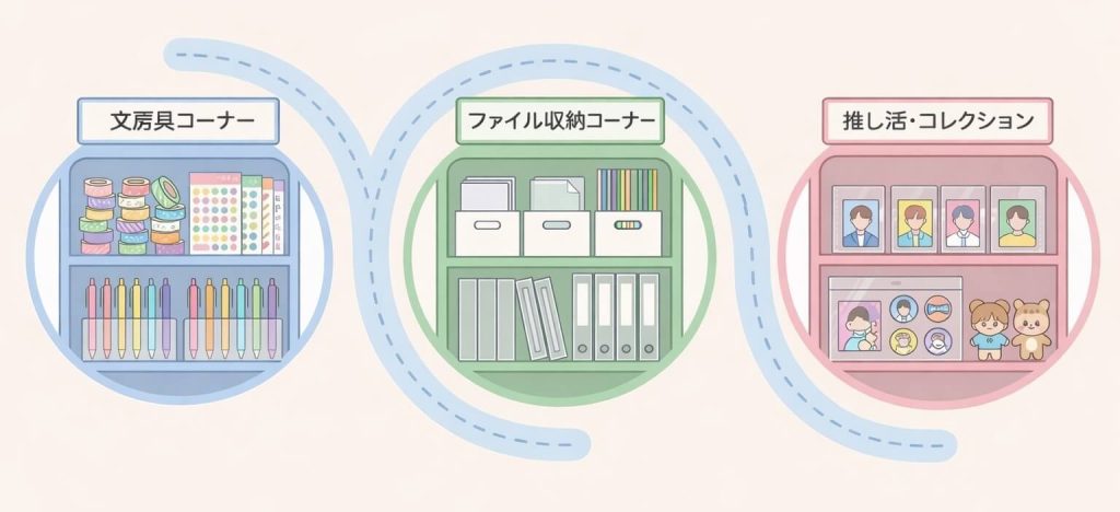 | ファイル収納コーナー | 6リングバインダー、リフィル | 手帳や事務用のバインダーの棚 |
