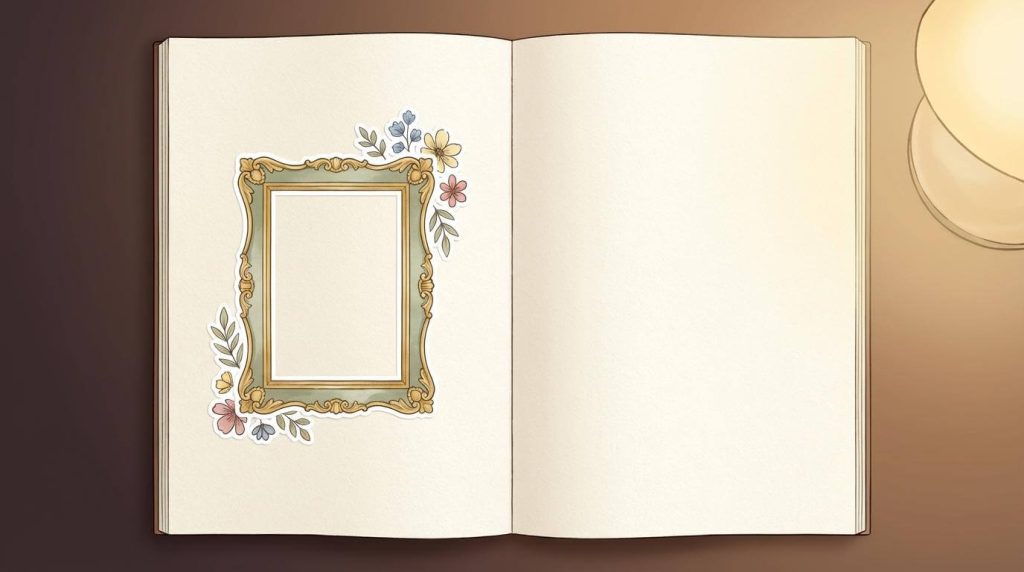 セリアで手に入る「フレームシール」や「ラインアートシール」を、まずはページの中に配置してみてください。枠を先に決めることで、その中に小さな物語が生まれます。