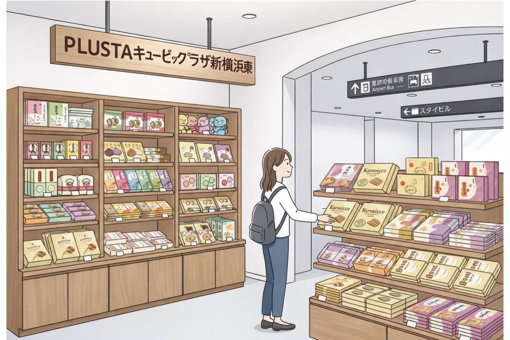 「PLUSTAキュービックプラザ新横浜東」は、2024年12月にグランドキヨスク新横浜からリニューアルオープンしました。新横浜駅2階(改札外)のコンコースにあり、崎陽軒のシウマイ、鎌倉紅谷のクルミッ子など横浜銘菓、お弁当、お土産が充実しています。