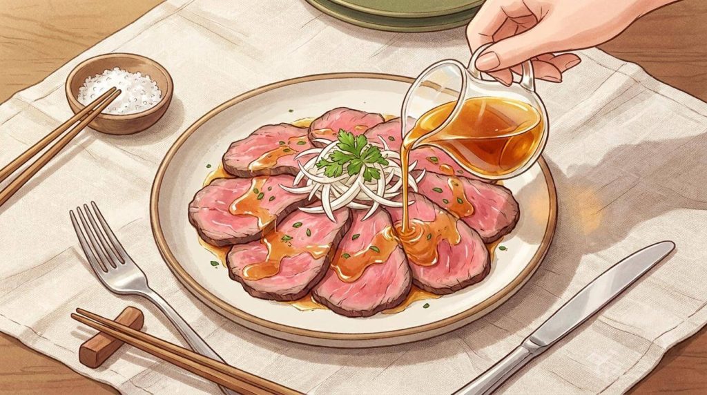 ぜひ試していただきたいのが、薄切りのローストビーフに回しかけ、オリーブオイルと合わせる洋風のアレンジです。和洋の境界線を超え、見慣れた家庭料理が洗練された一皿へと格上げされる瞬間をお楽しみください。