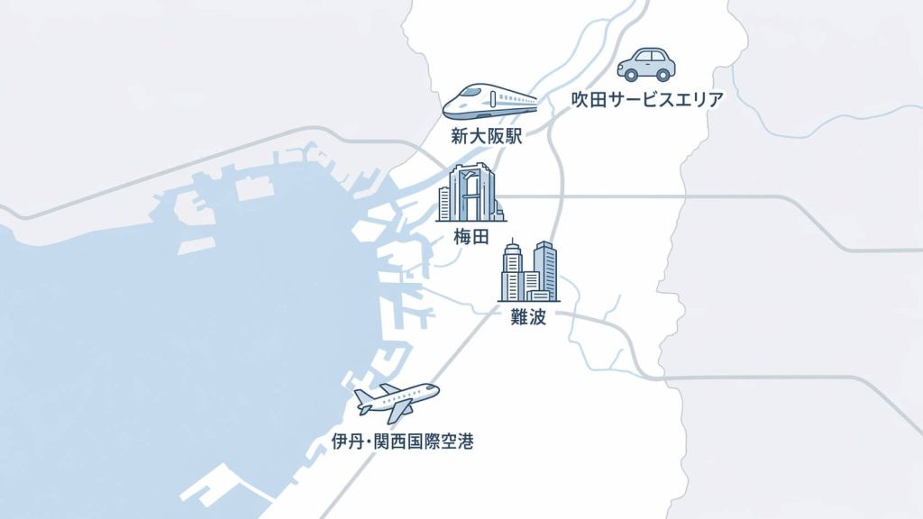 新大阪駅や空港といった便利な交通拠点から、地元の人に愛される地下街の直栄店、さらにはドライブの楽しみになるSA。