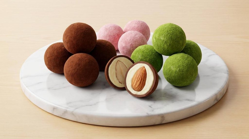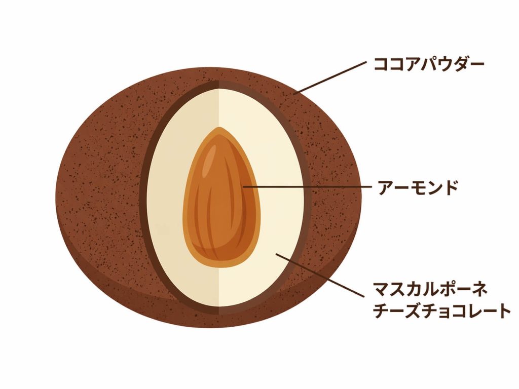 アーモンドにマスカルポーネチーズチョコを纏わせ、仕上げにほろ苦いココアパウダーをたっぷり。この潔いまでの王道感が、不動の人気を誇る理由です。一口食べれば、チーズのコクとココアの苦味が重なり合い、絶妙なハーモニーを奏でます。