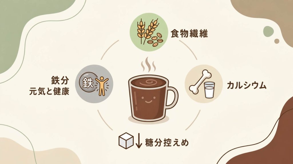 糖質を抑えつつ、食物繊維や鉄分、カルシウムをしっかり補える優秀なサポート飲料です。甘さ控えめのビターな風味は、まさに大人のための1杯と言えるでしょう。
