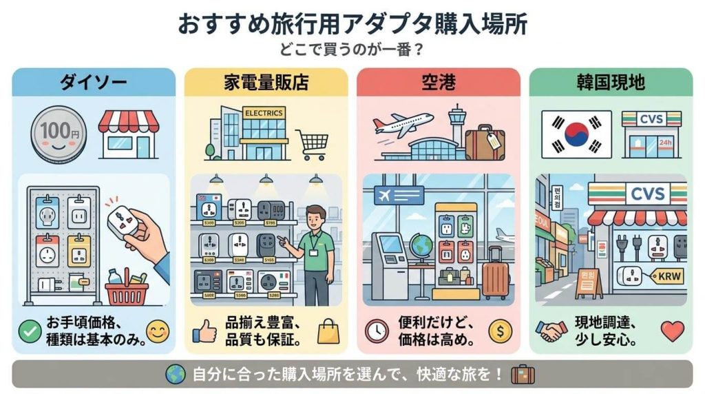 そこで今回は、韓国旅行に欠かせない「変換プラグ」について、日本国内のどこで買えるのか、100均、家電量販店、ドンキ、空港内の売店などを徹底比較しました。