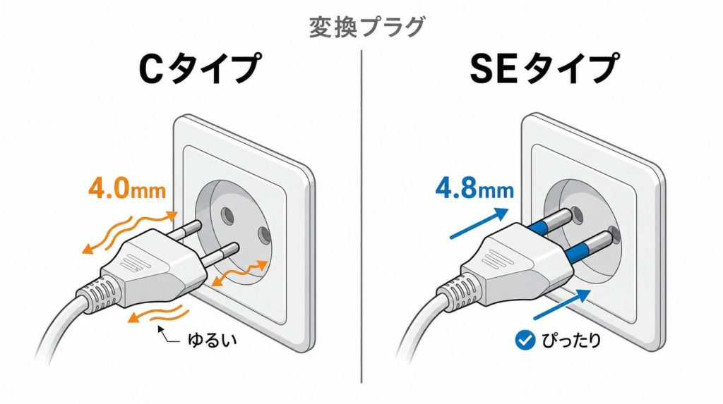 これに対応するプラグには「Cタイプ」と「SEタイプ」の2種類があります。「どちらを買っても同じでは?」と思うかもしれませんが、ここが大きな落とし穴です。 結論から言うと、韓国旅行には絶対に「SEタイプ」をおすすめします。