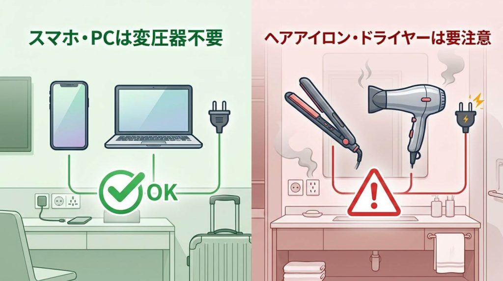 - スマホは変圧器不要で充電可能。ヘアアイロンは海外対応品を用意する