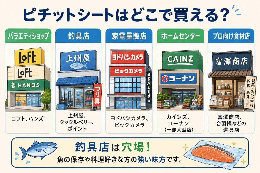 結論から言うと、ピチットシートは一般的な「スーパー」や「ドラッグストア」にはほとんど置いてありません。確実に手に入れるなら、キッチン用品が充実しているバラエティショップや、意外なところで「釣具店」を狙うのが正解です。
