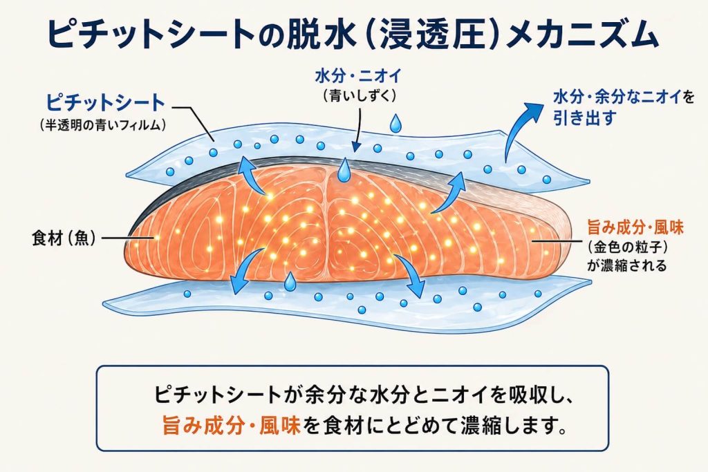 ピチットシートは「半透膜」という特殊な膜の中に、高濃度の糖が入っています。この「浸透圧」の力で、魚の細胞の中から水分と臭みだけを吸い出し、旨み成分は外に出さないという魔法のような働きをしています。