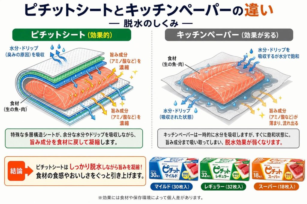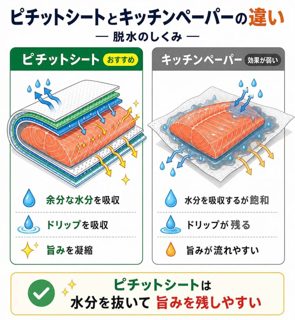 「ピチットシートの代わりに、キッチンペーパーで包んで塩を振ればいいのでは?」と考える方もいるでしょう。確かに塩にも浸透圧の力があり、水分を出すことは可能です。